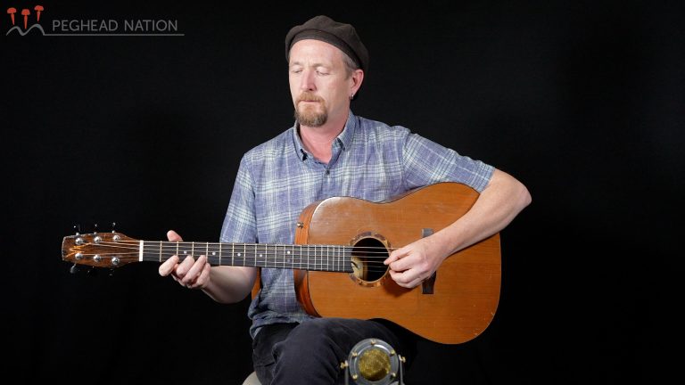 Peghead Nation clawhammer banjo instructor Evie Ladin demonstrates her vintage flattop guitar.
